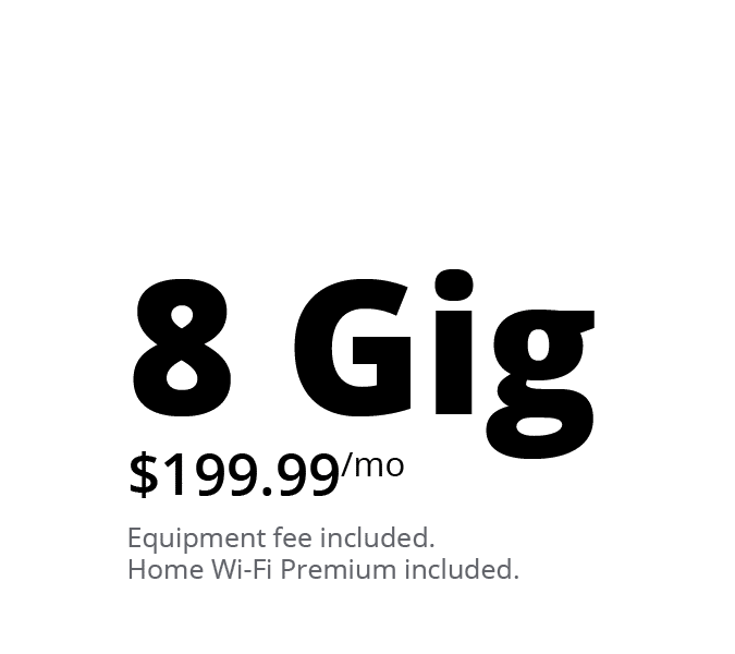 Pricing is guaranteed months 1-12. The price will go to current market price on month 13. Gig pricing will increase by $15 months 13-24 and will go to current market price on month 25. Home Wi-Fi or Home Wi-Fi Premium included with their respective speed options. Limited time offer. If additional work needs to be done to connect service to your home, a $250 plus tax construction fee will apply or will be waived if you commit to a 2-year agreement. Some restrictions apply. Call for details.